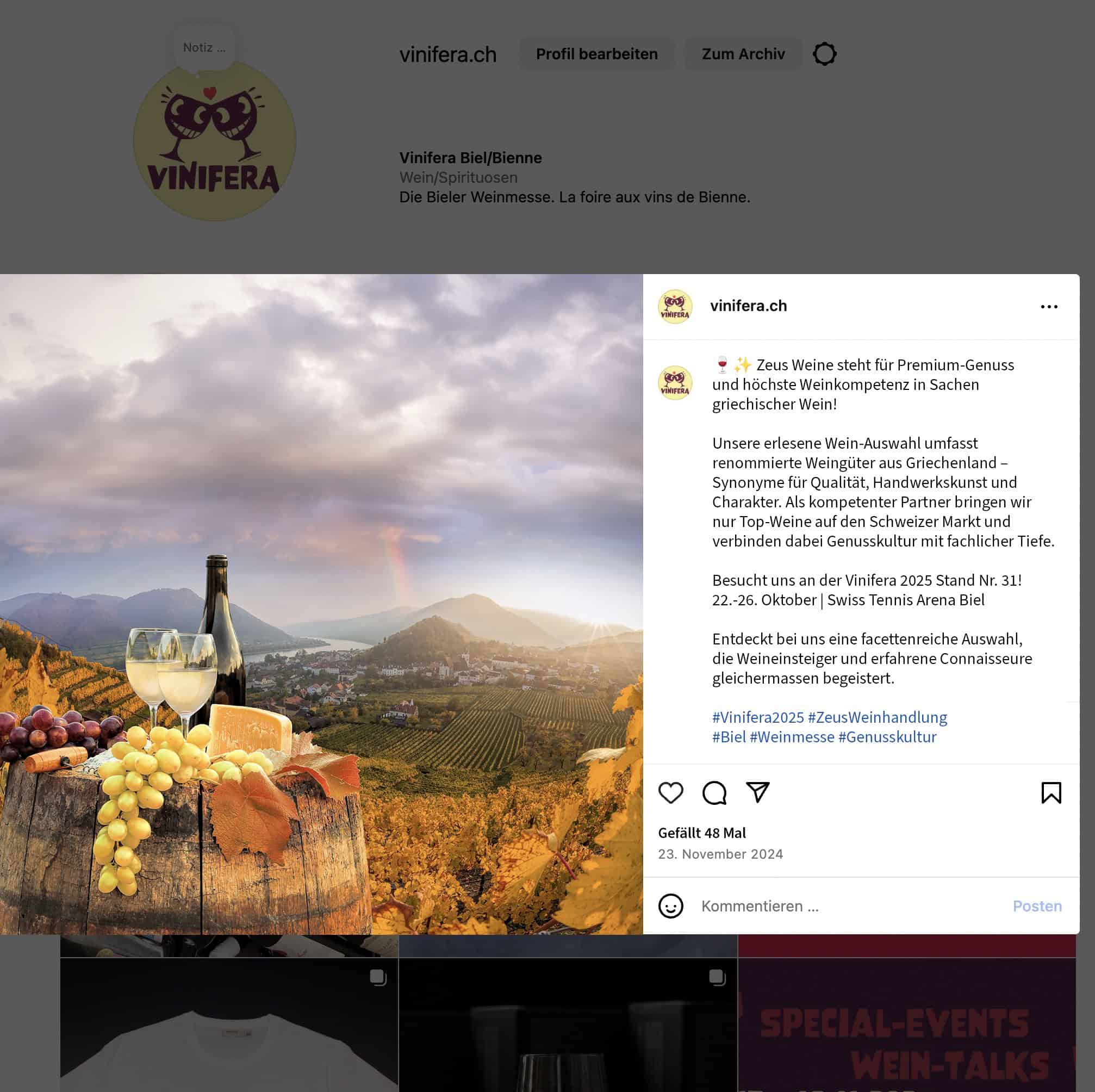 Als Herzstück der Vinifera sind Sie es, die mit Ihrer Leidenschaft für den Wein, Ihren einzigartigen Geschichten und besonderen Produkten die Messe zu dem machen, was sie ist. Damit Ihre Botschaften eine noch grössere Reichweite erhalten, möchten wir Ihre Inhalte gerne über die offiziellen Vinifera-Kanäle teilen.
